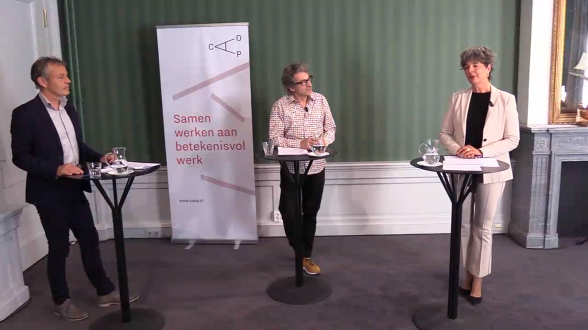 18 mei 2020CAOP-adviseur Ruud van der Aa en Marjolein ten Hoonte, directeur arbeidsmarkt Randstad Groep Nederland, gingen met elkaar in discussie tijdens de eerste webinar van de reeks ‘Hoe werken we na de crisis?’ Deze editie stond in het teken van de arbeidsmarkt. Onder leiding van gespreksleider Frénk van der Linden bespraken ze hoe de arbeidsmarkt eruitziet ná de coronacrisis.