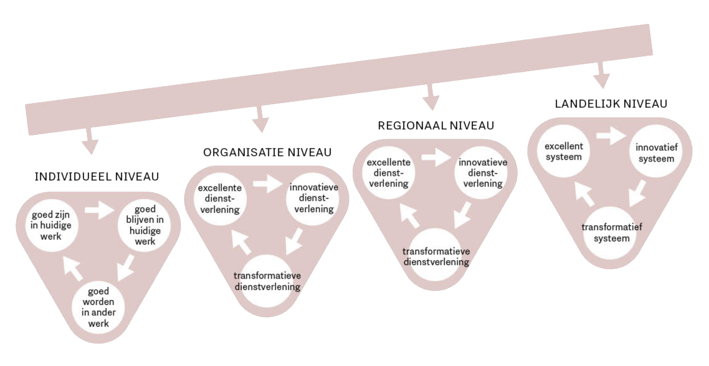 Op individueel niveau werken werkenden en werkzoekenden aan hun duurzame ontwikkeling, maar organisaties moeten hier op regionaal niveau de randvoorwaarden voor scheppen. Duurzame ontwikkeling is dan ook een verantwoordelijkheid van verschillende partijen op ieder niveau. We onderscheiden, naast het individuele niveau, de volgende niveaus: