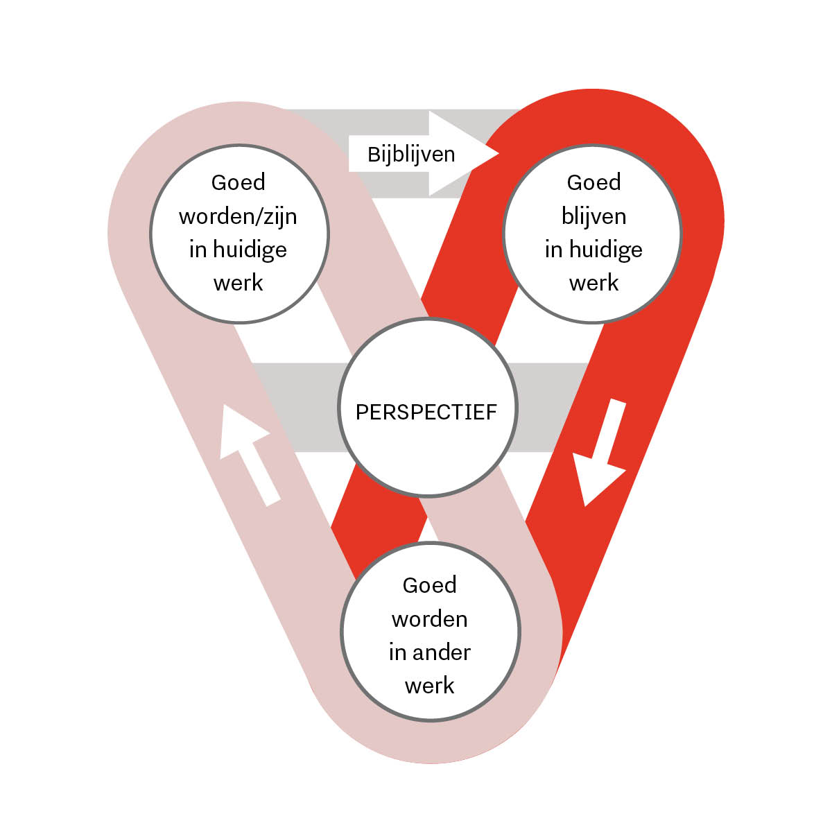 De situatie van een werkende bepaalt vaak op welke van de drie aspecten hij zich richt. Iemand die net zijn studie heeft afgerond, zal vooral bezig zijn met professionalisering, terwijl iemand die zijn baan dreigt te verliezen op zoek zal gaan naar ander werk (mobiliteit). Maar duurzaam ontwikkelen is pas echt effectief als werkenden zich op alle drie de aspecten richten en een actieve houding aannemen. Zo worden werkenden weerbaarder en wendbaarder. Kortom: naarmate professionaliteit, wendbaarheid en mobiliteit beter met elkaar verbonden zijn, houden werkenden en werkzoekenden meer perspectief op werk en inzetbaarheid. En dat komt zowel hun eigen (toekomstig) functioneren als de arbeidsmarkt ten goede.
