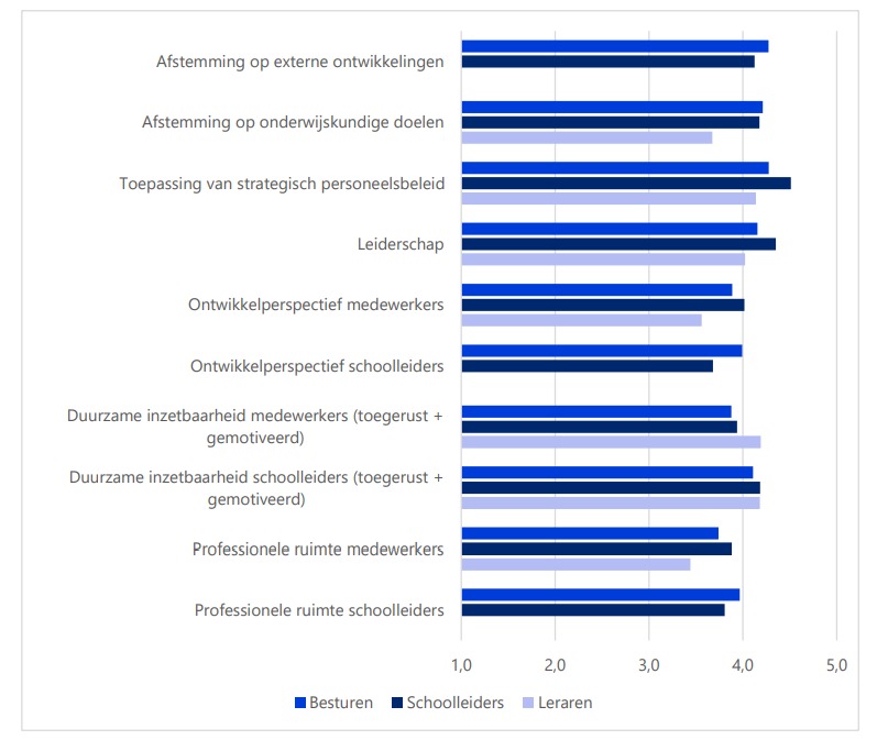 Het onderzoek laat over het algemeen positieve resultaten zien. Zo oordelen schoolleiders en bestuurders dat het personeelsbeleid goed is afgestemd op externe ontwikkelingen en de onderwijskundige doelen. Ook zijn zij positief over de toepassing van het strategisch personeelsbeleid en de wijze waarop schoolleiders leidinggeven (people management). Leraren beoordelen het beleid op deze punten iets lager en zien ruimte voor verbetering op gebieden als ontwikkelperspectief en professionele ruimte van medewerkers. Maar ondanks dat beoordelen ook zij het beleid over het algemeen als ruim voldoende.