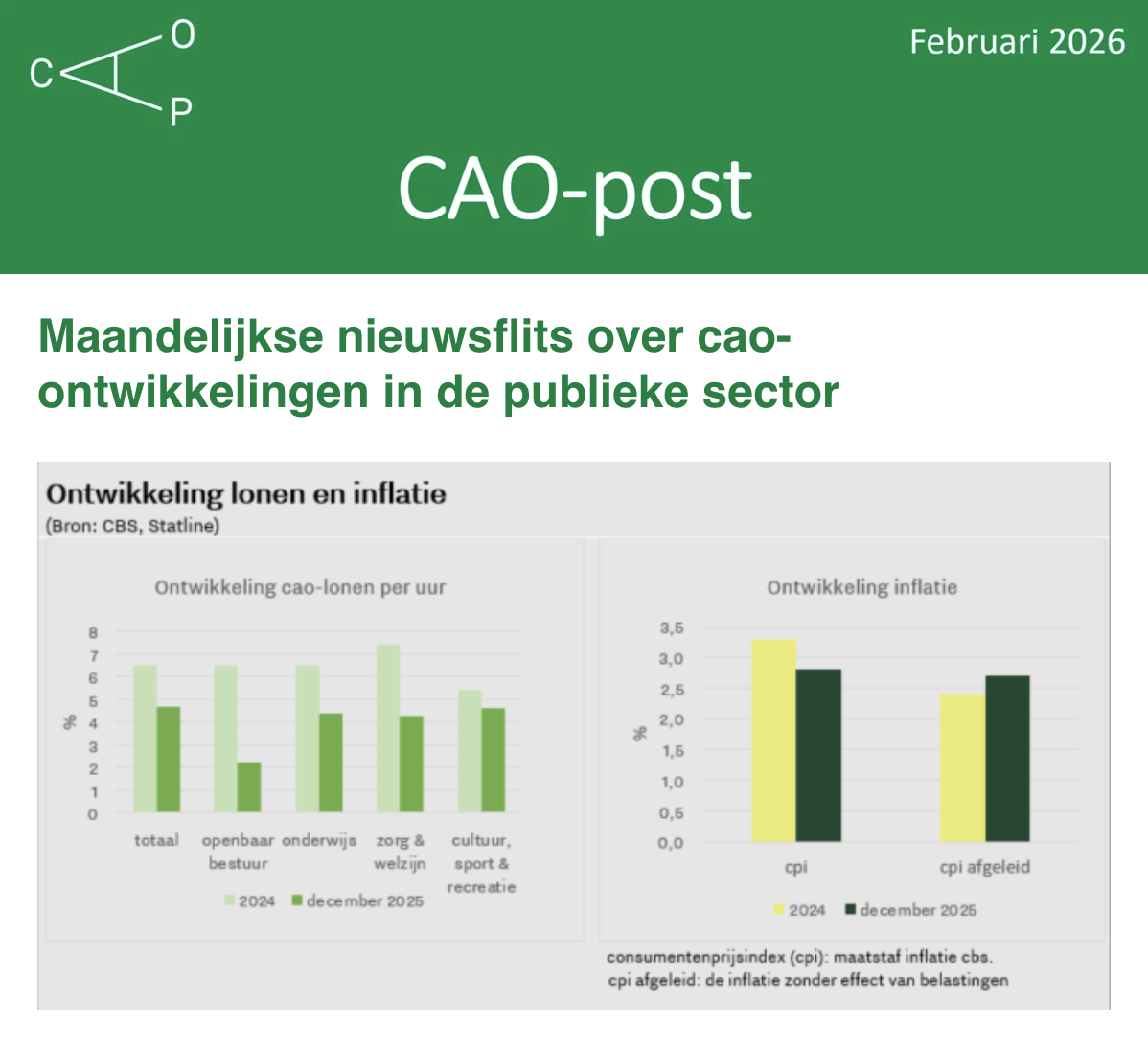 CAO-Post brengt cao-afspraken op centrale thema’s samen en maakt in één oogopslag zichtbaar waar overeenkomsten en verschillen liggen en welke bredere trends zich voordoen. Daarbij kijken we ook over de grenzen van de publieke sector heen naar relevante cao-ontwikkelingen in de marktsector.