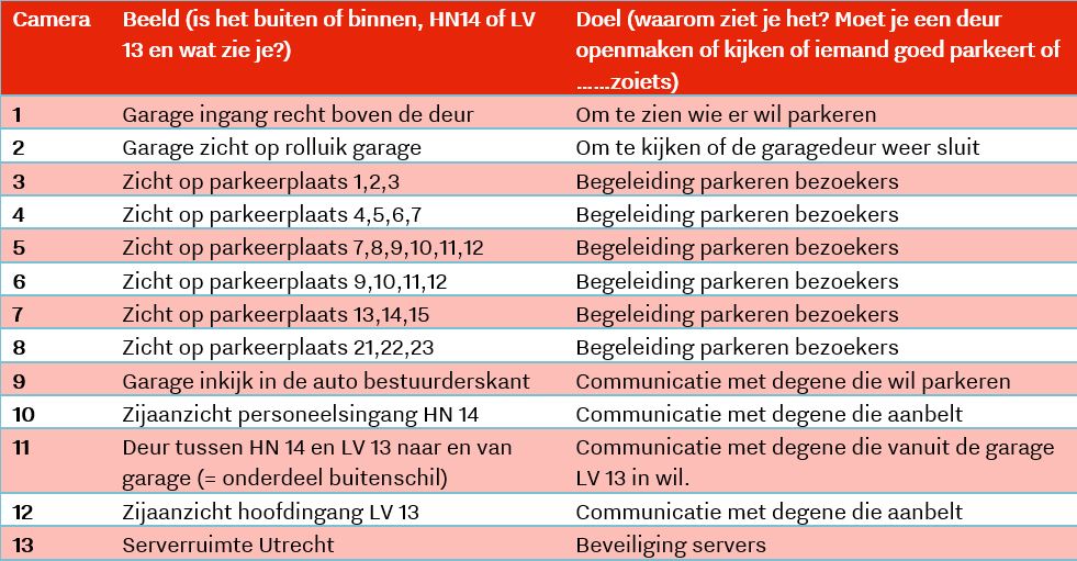 De beelden van de camera’s in de garage en de garage ingang met uitzondering van de camera op de intercominstallatie worden geprojecteerd op het scherm van de receptioniste. De camera’s van de intercominstallatie worden getoond op het scherm van de intercominstallatie bij de receptie na indrukken van de bel op de vier intercombellen. De beelden van de camera in Utrecht worden niet standaard geprojecteerd op een scherm. De ICT-beheerders kunnen desgewenst de beelden op hun beeldscherm bekijken.